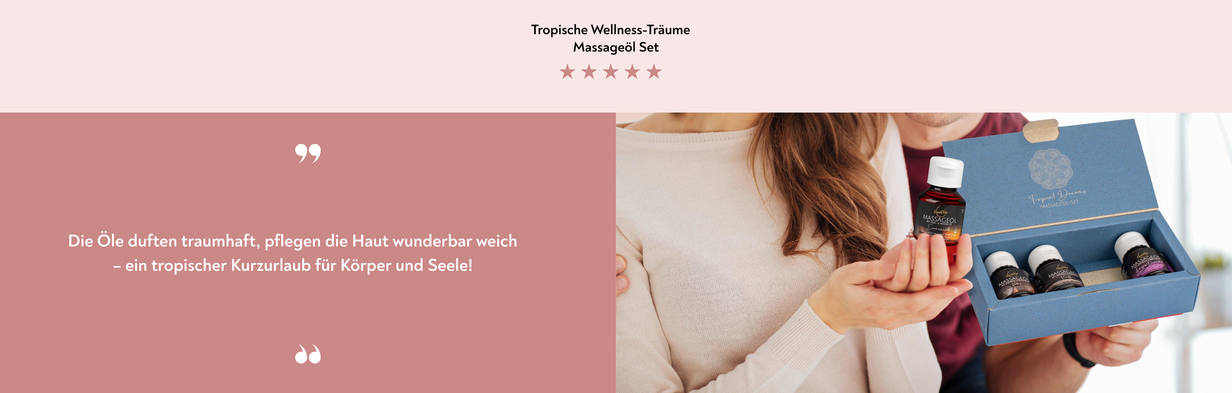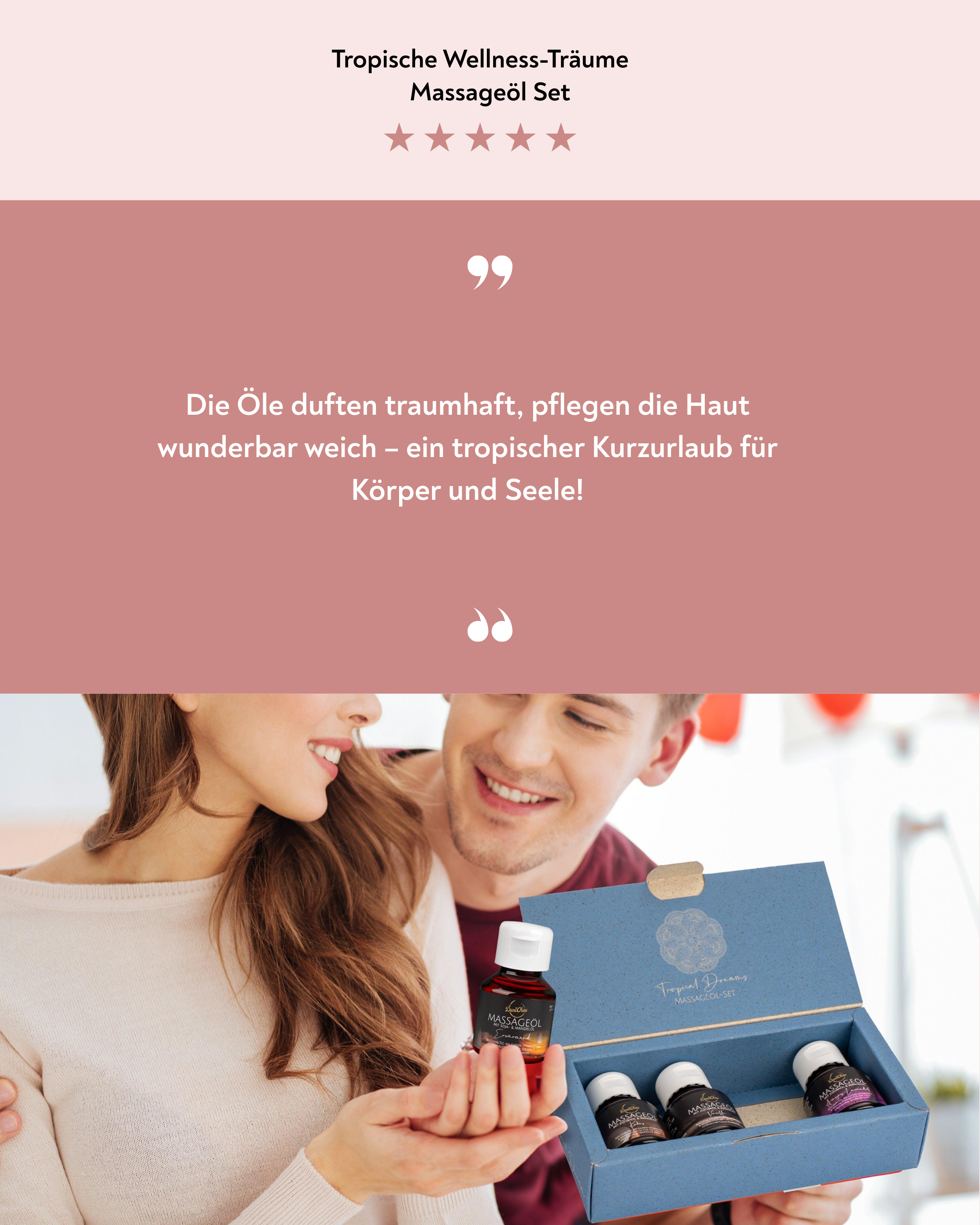 Unser Massageöl Set wurde in Deutschland entwickelt und hergestellt – garantiert Made in Germany. Jedes Öl überzeugt durch ausgewählte, natürliche Inhaltsstoffe und feine Duftnuancen, die deinen Körper verwöhnen und Geist sowie Sinne beruhigen.